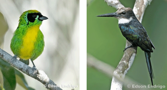 Edson Endrigo enviou várias opções, das quais escolhemos duas: uma da família Galbulidae, a Ariramba-do-paraíso (Galbula dea), e a Saíra-ouro (Tangara schrankii), da família Thraupidae.